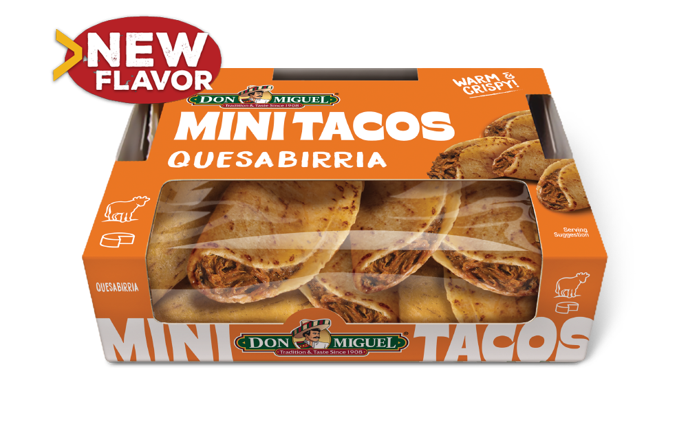 Reach for a craveable snack on the go that is sure to please. The new DON MIGUEL® Quesabirria Beef Mini Tacos are made with tender seasoned beef, Monterey Jack cheese, and a blend of spices and chiles served in a crispy corn tortilla. Pair them with your favorite salsa, sauce, or guacamole. Available at convenience stores throughout the US.